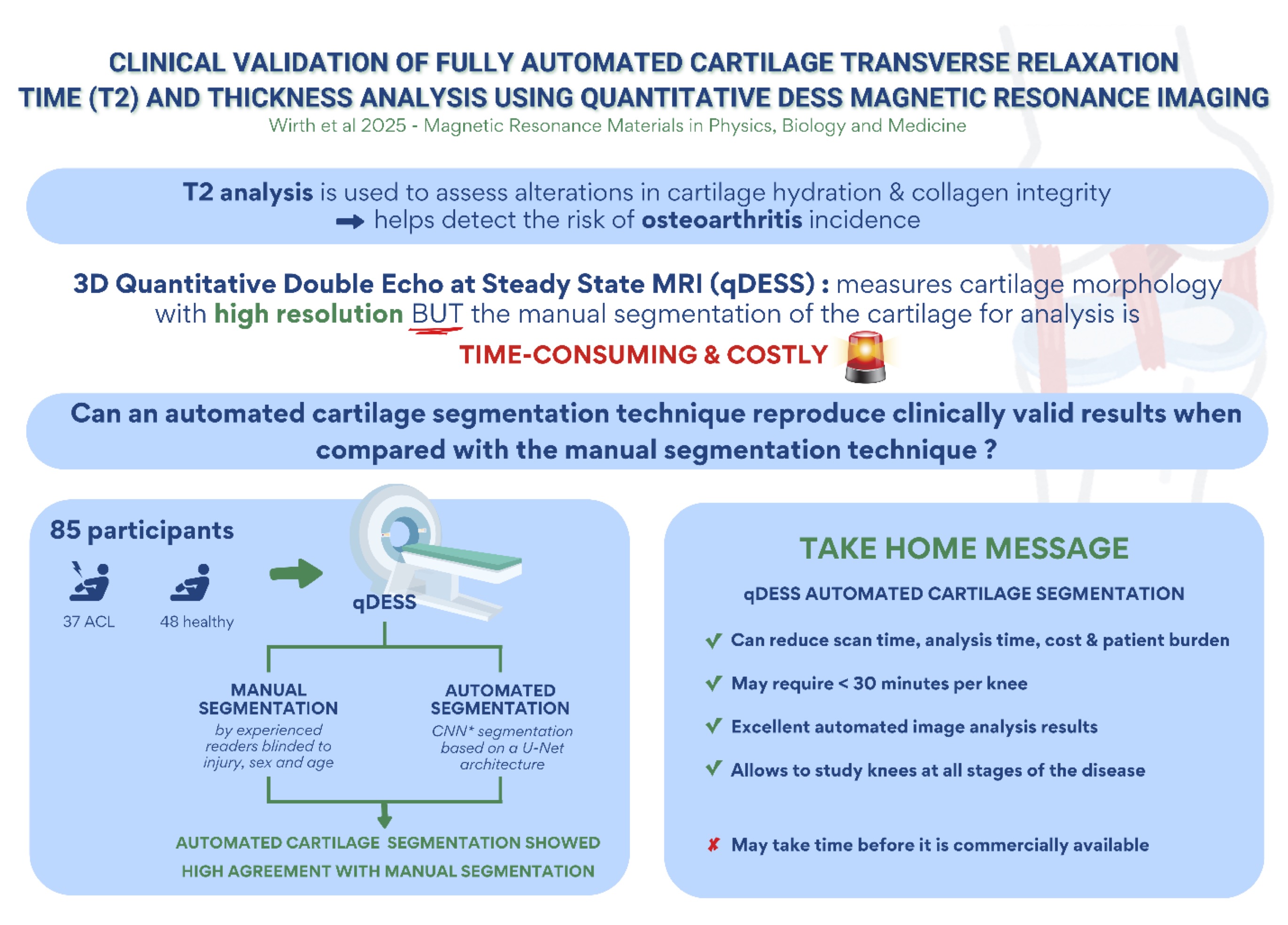 Improvements also have been made in cartilage segmentation, with AI-based convolutional neural network (CNN) algorithm available that can robustly and comprehensively segment image repositories of knee images obtained by MESE or qDESS from large cohorts. With qDESS, the additional advantage is that the automated segmentation not only permits the measurement of cartilage T2, but cartilage morphology (thickness) in parallel, without requiring a 2nd set of segmentations (manual or automated).