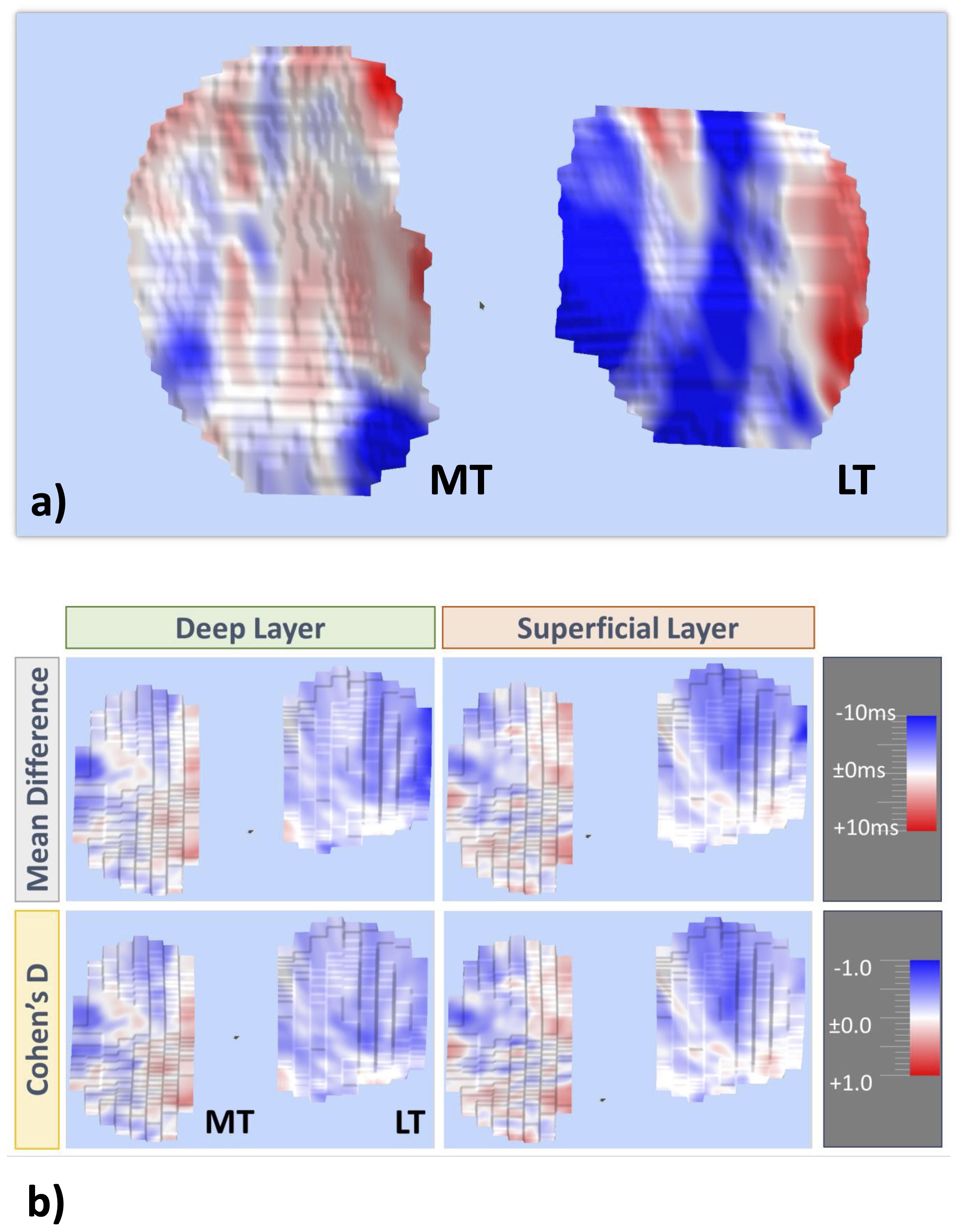 Figure 6. Longitudinal analysis of the spatial distribution of T2 changes across the cartilage surfaces: a) Example of a spatial color coded map of longitudinal T2 change in the deep and superficial tibial cartilage layer, respectively; b) Illustration of longitudinal T2 change in the deep and superficial layers of the medial and lateral tibia (MT/LT) in case vs. control knees visualizing the spatial pattern of the mean T2 difference for both cohorts as well as the effect size characterizing the strength of these differences (Cohen’s D)